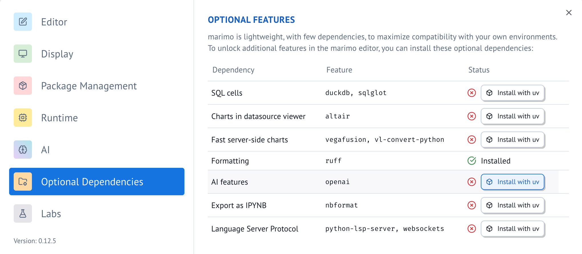 marimo using pip/uv if you need Copilot.